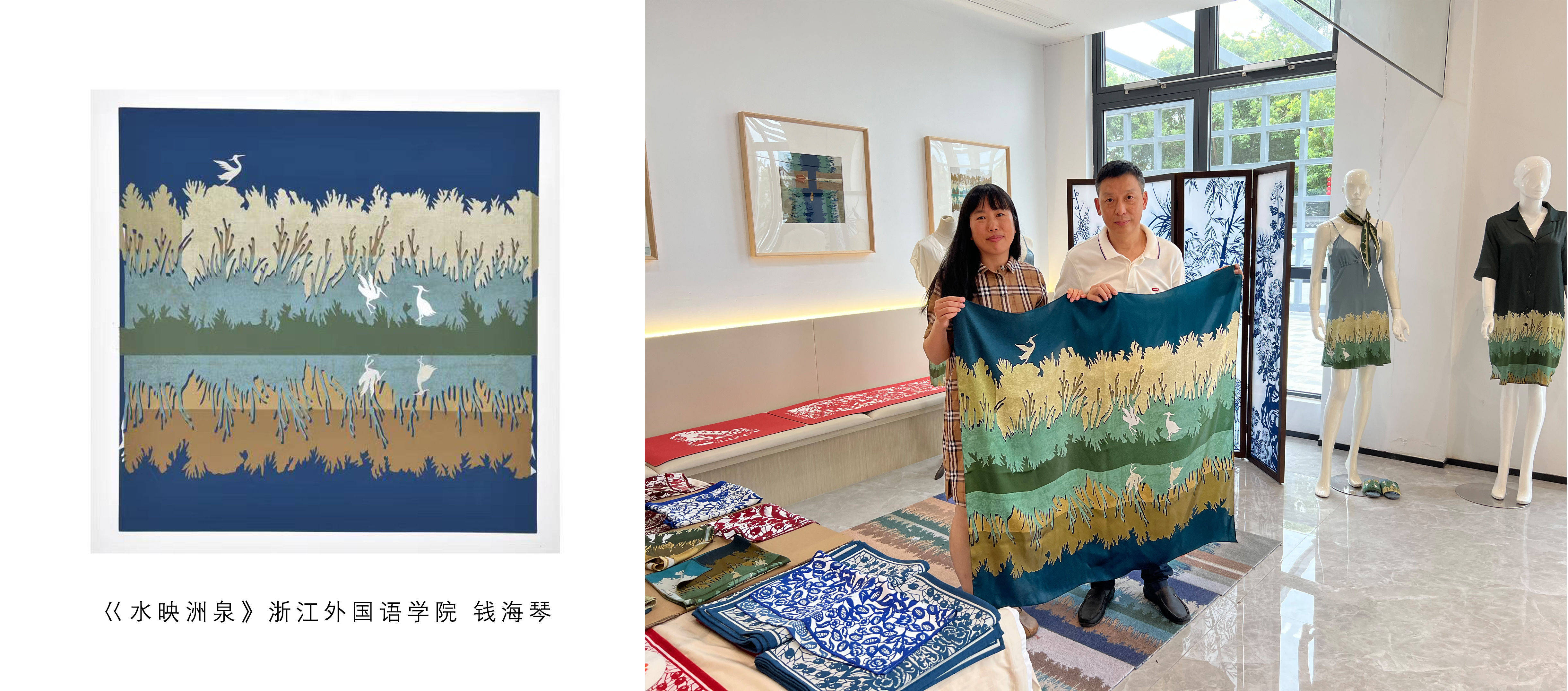 屠霁彦和他的丝巾代表作创作者合影 ,剪纸代表作——《水映洲泉》,作者钱海琴