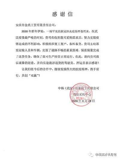 2020年新年伊始,一场罕见的新冠肺炎疫情席卷而来。在武汉疫情最严峻的时刻,金亮公司在收到中韩(武汉)石油化工有限公司采购需求后,努力克服疫情造成的不利影响,积极组织复工复产、备料备货,主动落实运输人员和车辆,克服了道路不畅的重重困难,保质保量完成了送货任务,确保了中韩(武汉)石油化工有限公司生产经营正常运行。