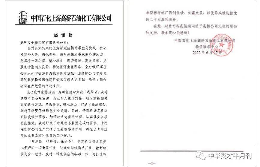 中国石化上海高桥石油化工有限公司认为,安庆市金亮工贸有限责任公司能够面对来势汹汹的疫情,及时调整产能,备足货源,多措并举,精准发力,打通了物流瓶颈,架起了物资保供绿色安全通道,及时纾缓了水处理等装置液碱的需求,为稳定高桥公司生产发挥了至关重要的作用,彰显了金亮工贸公司过硬的业务素质和优良的工作作风。