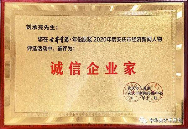 2021年12月,安庆市工商业联合会与安庆市新闻传媒中心联合授予刘承亮为“安庆市诚信企业家”称号。